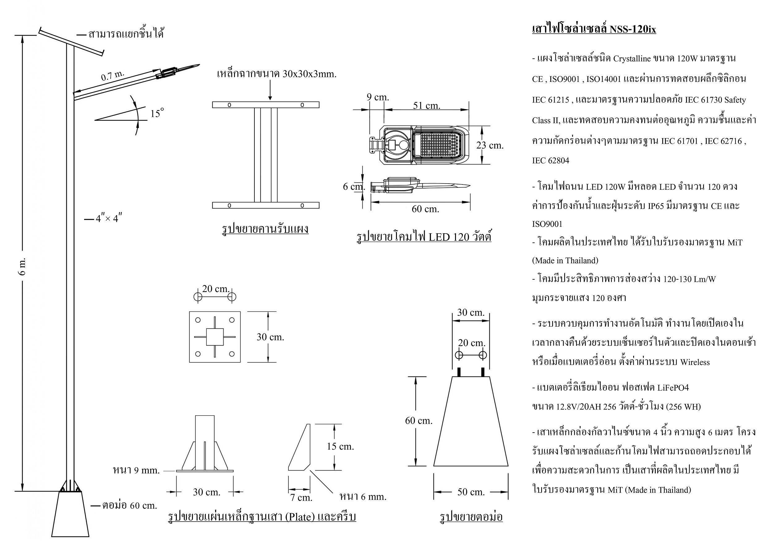 ไฟถนนโซล่าเซลล์ 120W สำหรับติดตั้งบนเสาสูง 4-6 เมตร ให้ความส่องสว่างด้วย LED ชนิดสว่างพิเศษ